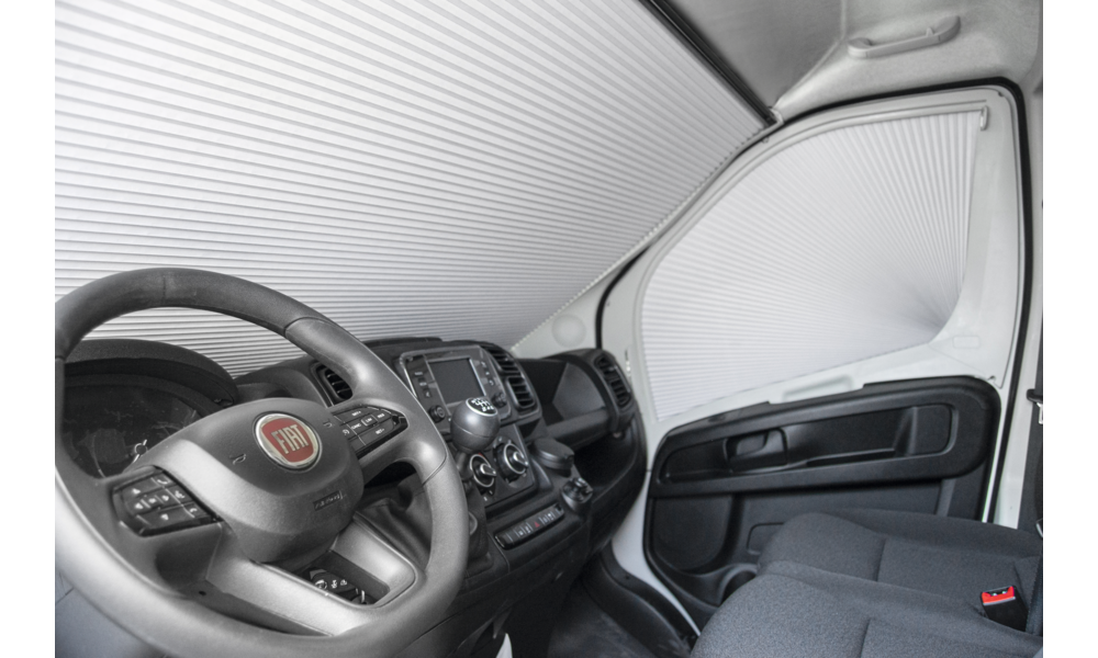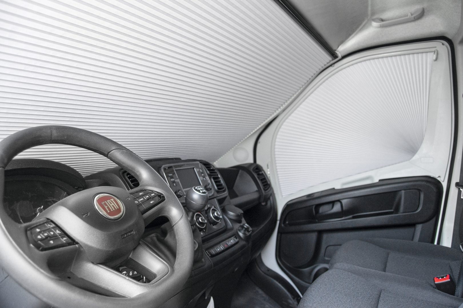 Neu entwickelt und für höchste Ansprüche konzipiert: darkSTAR - das doppelt plissierte Frontscheibenrollo für Fiat Ducato X250/X290 und baugleiche Modelle.