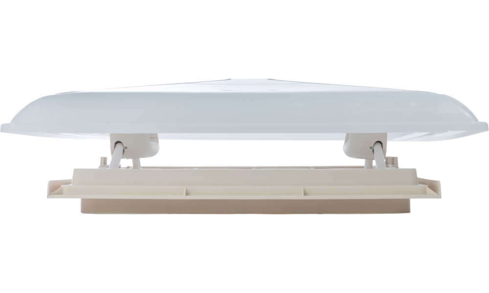 Dachausschnitt 400 x 400 mm. Für Dachstärken 24 - 46 mm. Mit Lüftungshaube 480 x 480 mm, Milchglas, Teleskopausstellern, Tastenverriegelung. Rahmenfarbe beige.