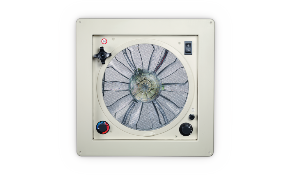 12 V-Dachventilatoren mit integriertem regelbarem Lüfter. Das Herzstück aller Modelle ist der Rotor mit zehn durchsichtigen Blättern sowie der Motor mit drei verschiedenen Drehzahlen für Vor- und Rückwärtslauf (Be- und Entlüftung). Alle Dachventilatoren sind mit einem abnehmbaren Schutzgitter gegen Insekten ausgestattet. Dachausschnitt 40 x 40 cm, Haubenmaß 47 x 47 cm, Aufbauhöhe 12,5 cm.