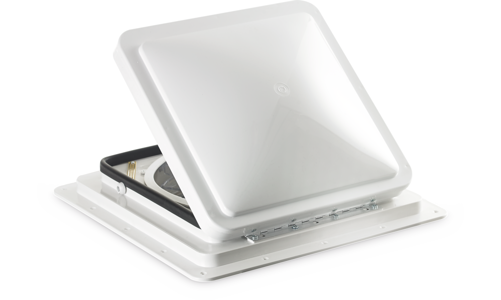 12 V-Dachventilatoren mit integriertem regelbarem Lüfter. Das Herzstück aller Modelle ist der Rotor mit zehn durchsichtigen Blättern sowie der Motor mit drei verschiedenen Drehzahlen für Vor- und Rückwärtslauf (Be- und Entlüftung). Alle Dachventilatoren sind mit einem abnehmbaren Schutzgitter gegen Insekten ausgestattet. Dachausschnitt 40 x 40 cm, Haubenmaß 47 x 47 cm, Aufbauhöhe 12,5 cm.