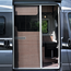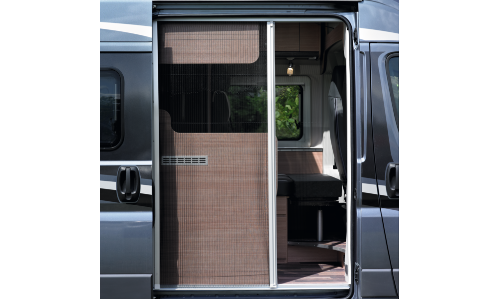 Einfach plissierter hochwertiger Insektenschutz für Schiebetüren des Fiat Ducato H2 X250-/X290-Modelle und baugleicher Fahrzeuge. Er deckt die Tür komplett ab und ist mit einem Magnetverschluss versehen.