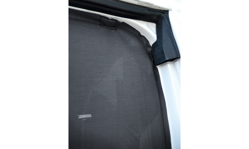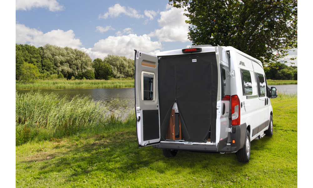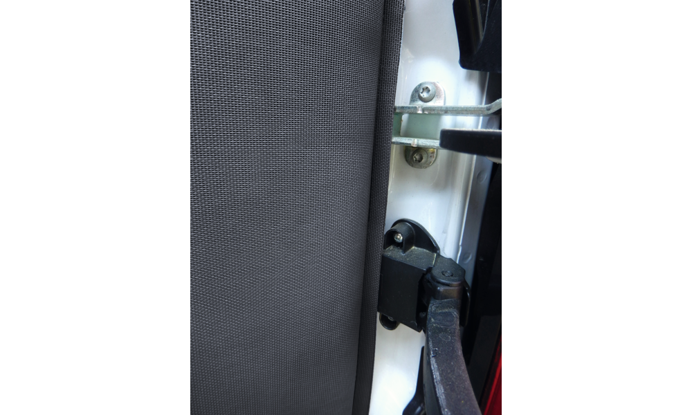 Hoher Türausschnitt. Aufrollbar, mit 2 Reißverschlüssen, Magnetbefestigung.
