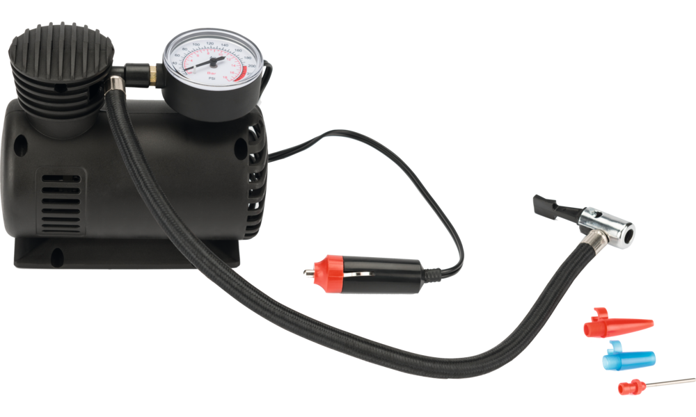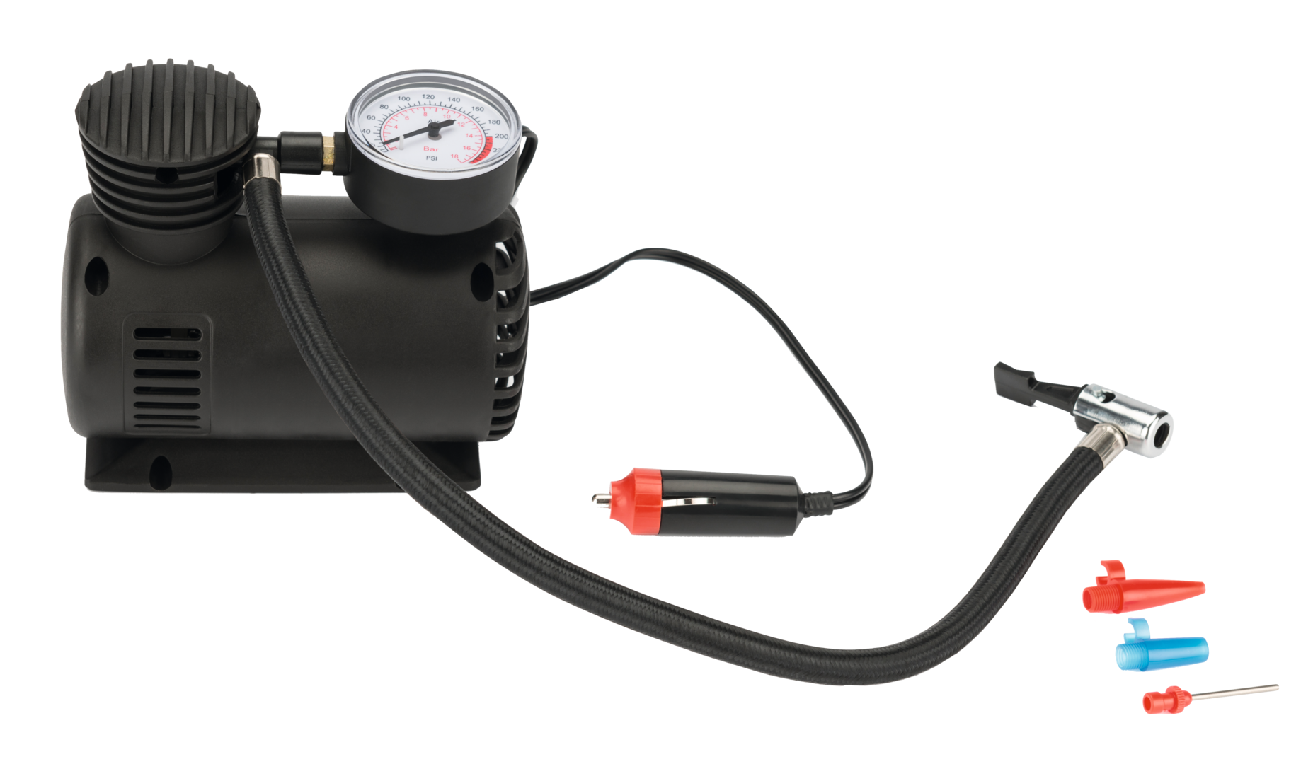 12 V/10 A, 250 PSI/17 Bar, Anschlusskabel mit 12 V-Zigarettenanzünderstecker, 3 Adapter, Schlauchlänge ca. 0,5 m.