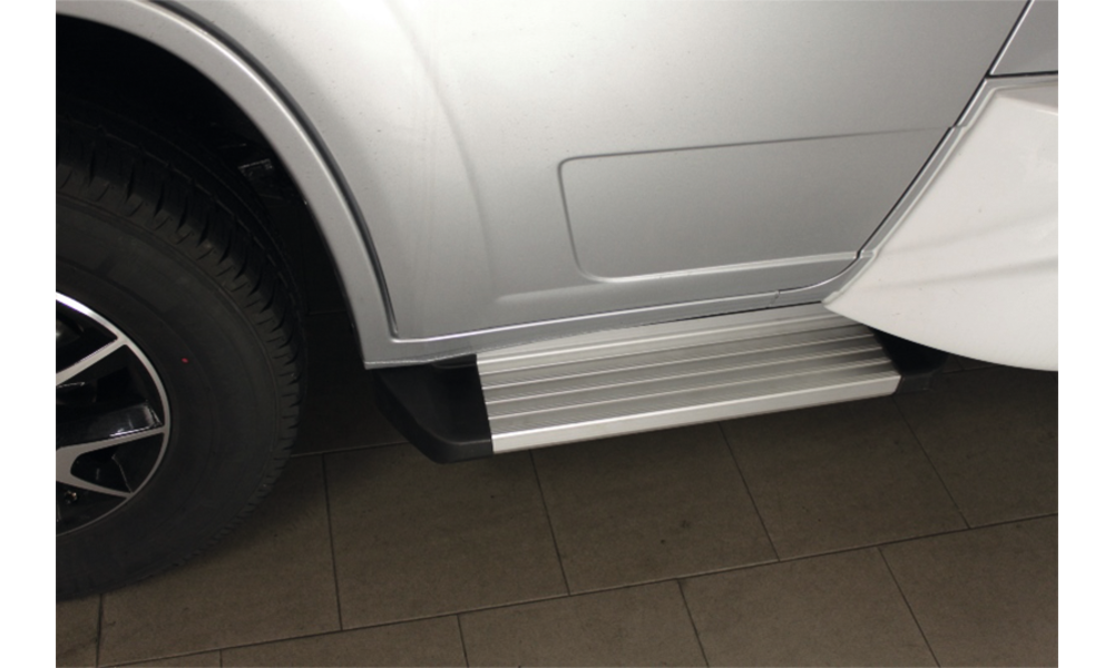 Die Freistufe wird durch fahrzeugspezifische und mitgelieferte Edelstahl-Konsolen am und unterm Fahrzeugholm fest verschraubt. Die Konstruktion der Konsolen gewährleistet eine spätere Traglast von mindestens 140 kg pro Trittstufe.