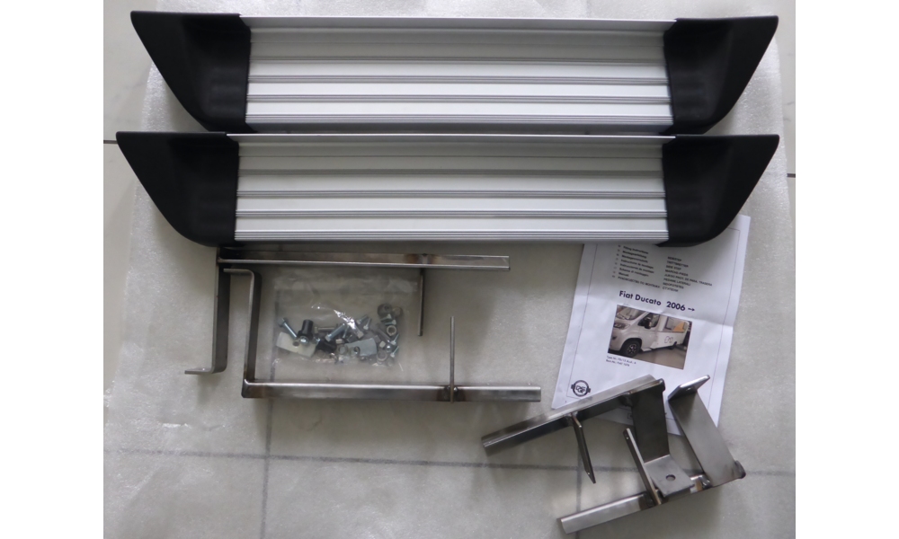 Lieferumfang: 2 eloxierte und profilierte Aluminiumtrittstufen (Fahrer- und Beifahrerseite), 4 optisch angepasste, hochstabile Sicherheitsendkappen, 4 Edelstahlhalter, Befestigungsmaterial, Montageschablone aus Edelstahl, Montageanleitung und ABE.
