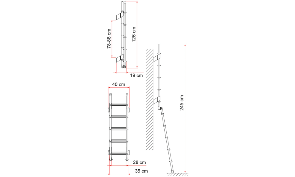 Gesamtlänge 245 cm, zusammengeklappt 126 cm. Gesamtbreite 40 cm. Tiefe 19 cm.