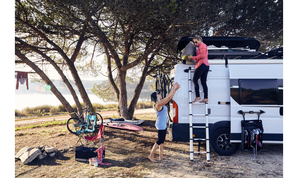 Die Leiter kann mit dem Magnetbefestigungs-Set an der Fahrzeugseitenwand gesichert werden und an allen Seiten des Vans genutzt werden. Sicher und stabil auf allen Untergründen, Luftdrucksystem zum sicheren Einschieben der Leiter als Einklemmschutz, kompakte Größe zum einfachen Transport.