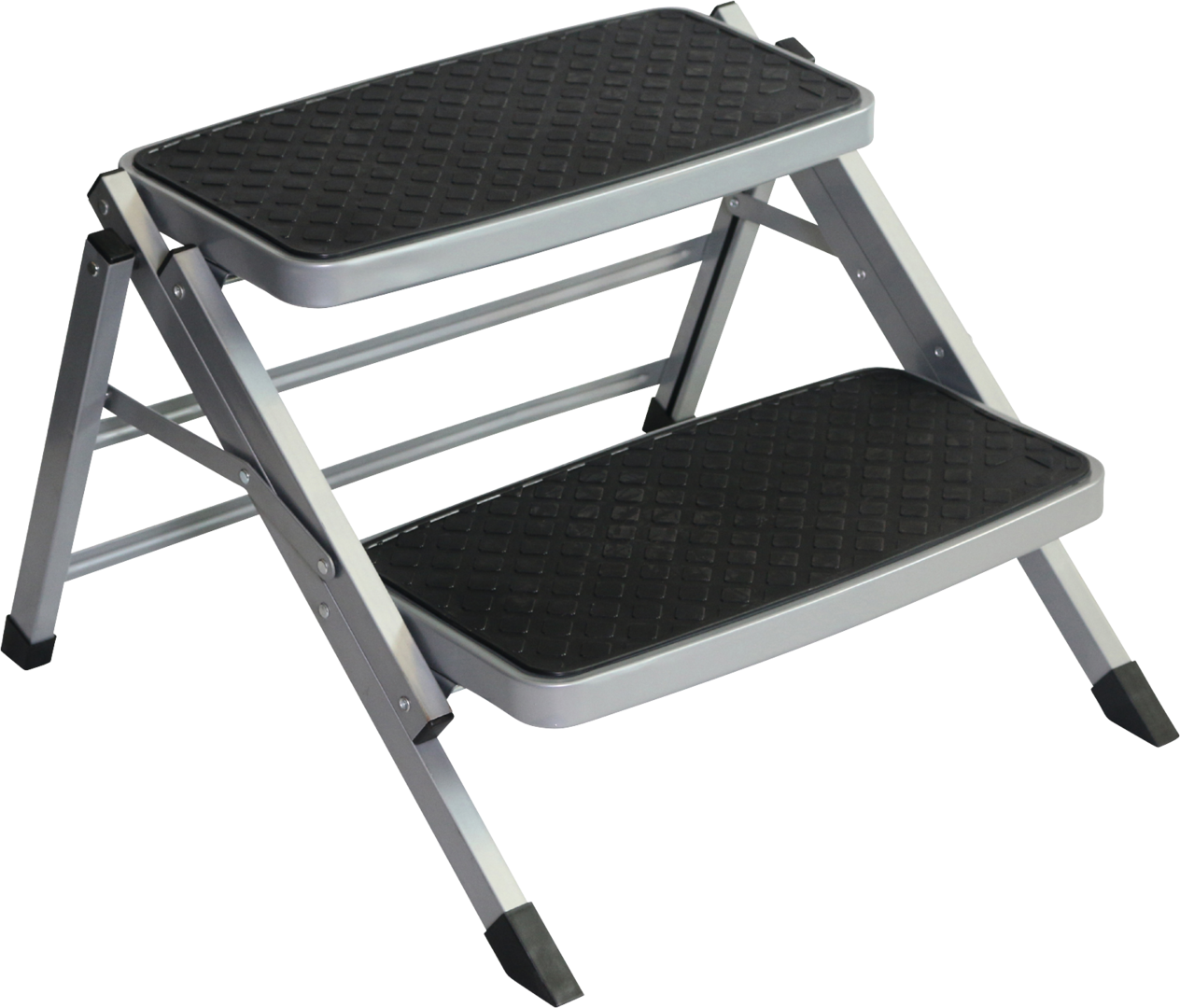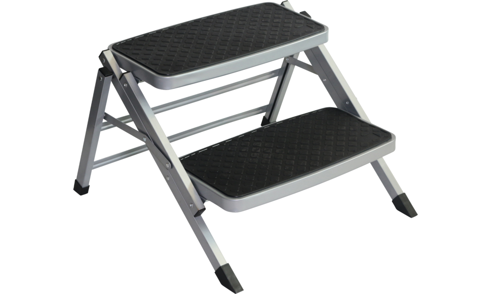 Faltbare Doppeltrittstufe mit stabilem Stahlgestell und rutschfester Gummi-Trittfläche.