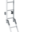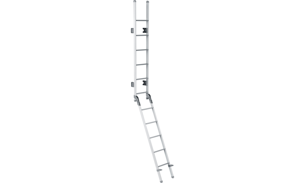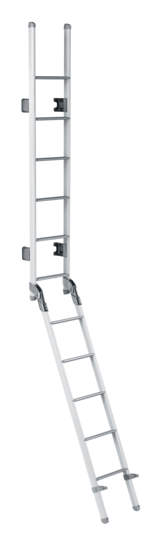 Einklappbare Doppelleiter für die Rückwandmontage. Länge geklappt 158 cm, ausgeklappt 270 cm. Breite 30 cm.