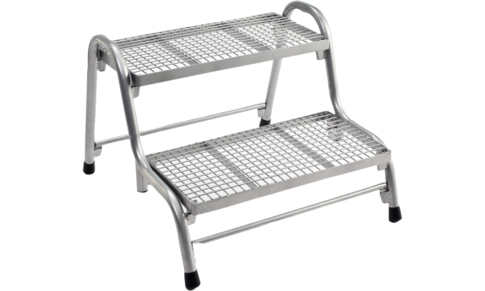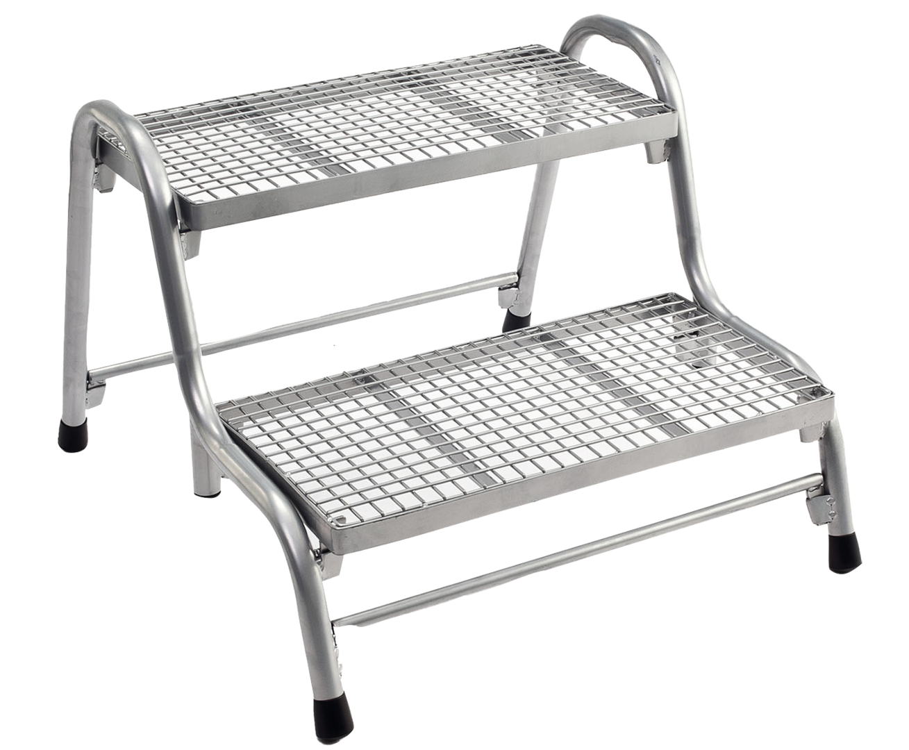 Stabile Doppeltrittstufe aus verzinktem Metall. In kürzester Zeit auf- oder abgebaut.