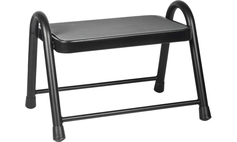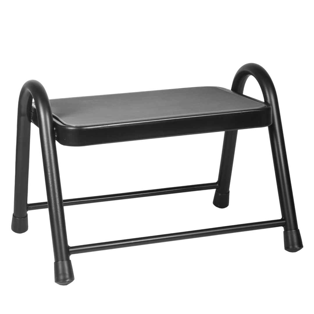 Einzeltrittstufe mit stabilem Stahlgestell und rutschfester Gummi-Trittfläche. Belastbar bis 150 kg.