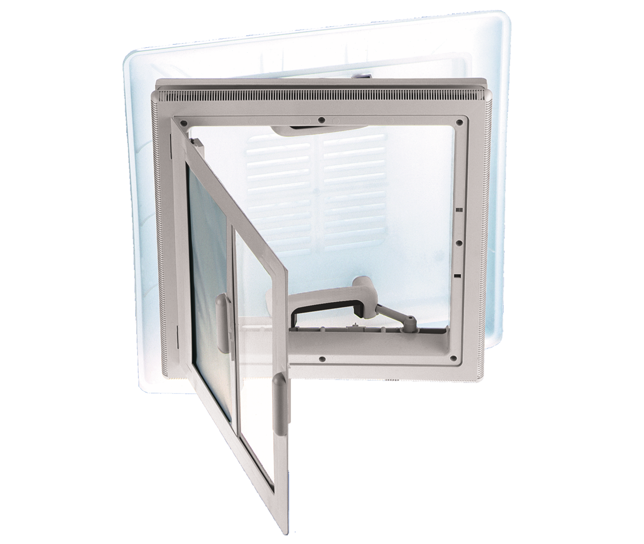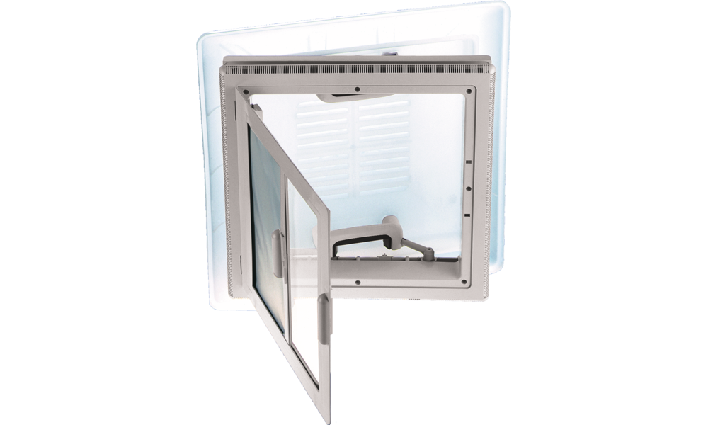 Mit abklappbarem Netzrahmen und Verdunklungsrollo. Ausschnittmaß 400 x 400 mm, Haubenmaß 560 x 560 mm, Dauerlüftung 150 cm², Höhe über Dach 92 mm, Dachdicke von 24 bis 56 mm.
