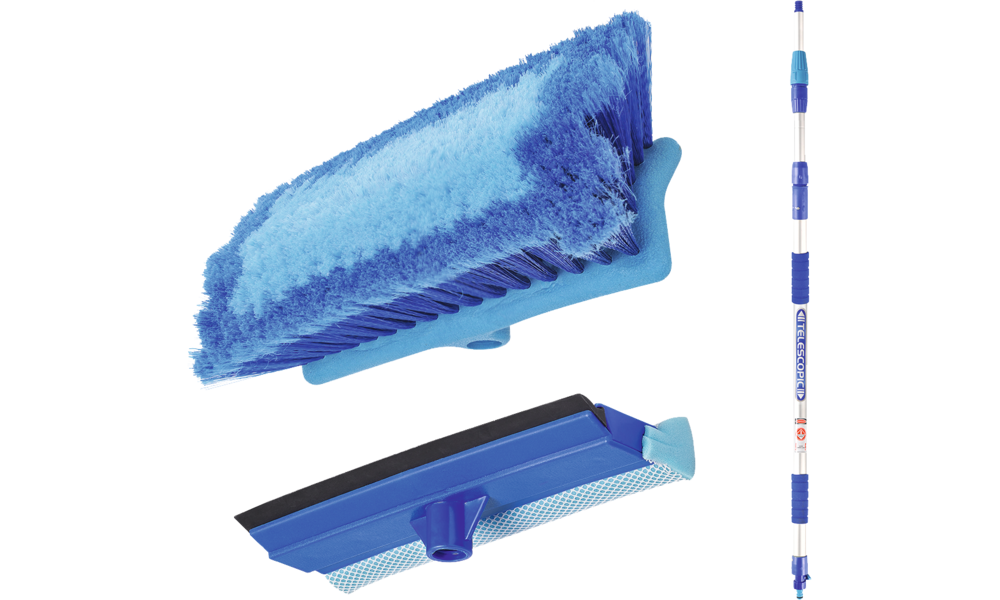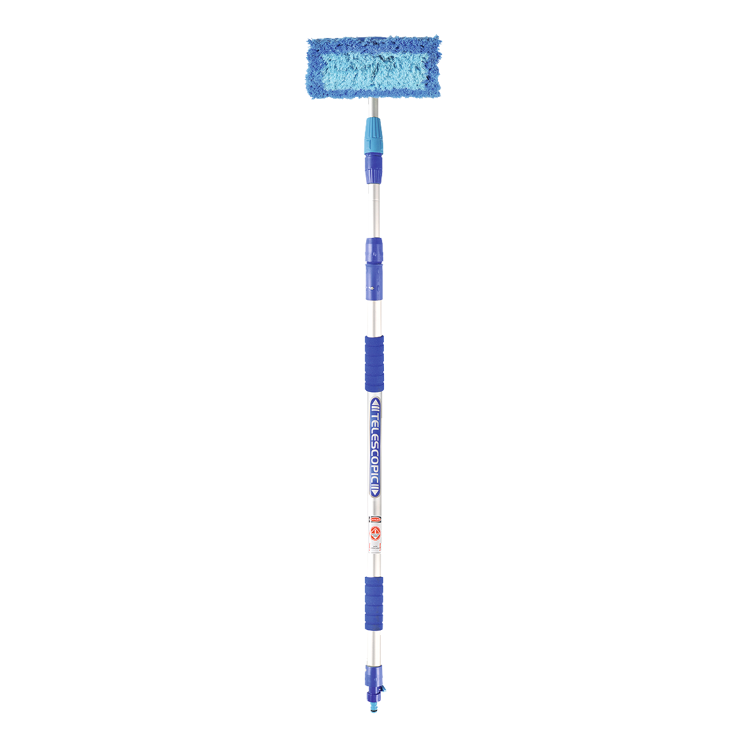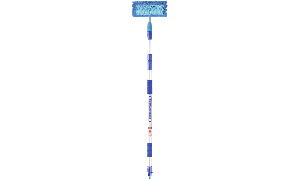 Teleskop-Waschbürste Heavy Duty. Waschbürste mit Alu-Teleskopstab, Schnellkupplung und Ein-/Ausschalter. Mit zusätzlichem Scheibenreiniger-Aufsatz. Teleskopierbar bis 300 cm. Optimal geeignet für Autos, Kleinbusse, Wohnwagen und Wohnmobile.