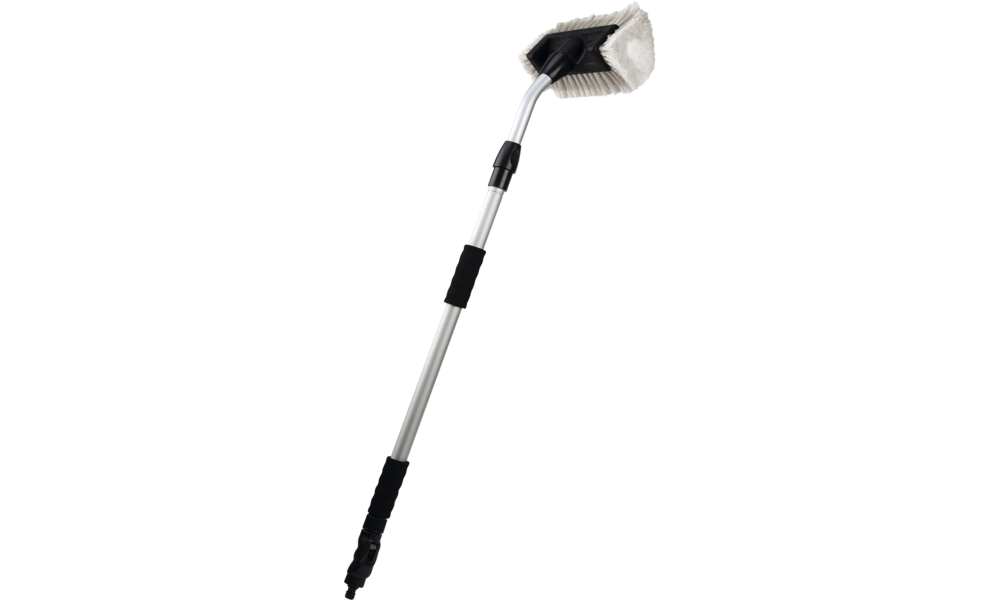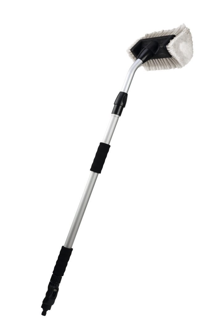 Waschbürste PREMIUM. Führungsstiel mit ca. 30° gebogenem Radius bietet noch leichteres und bequemeres Reinigen. Steckverbindung verhindert ein Lockern oder Verdrehen. Inklusive Alu-Teleskopstab (Länge 95 - 160 cm, ø 28/25 mm) und Wasser-Regulator.