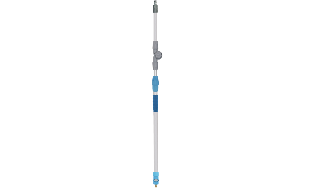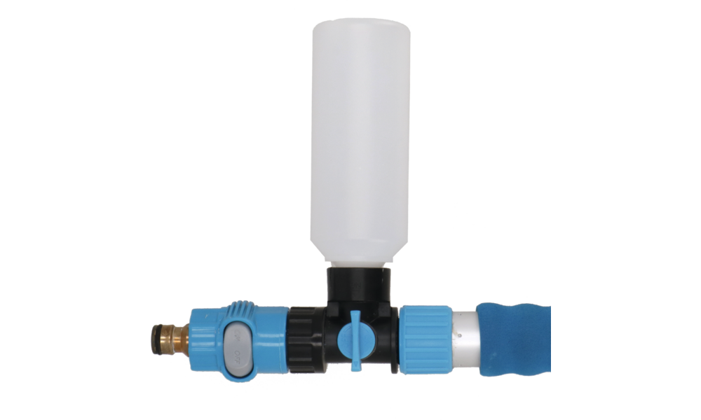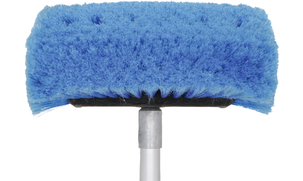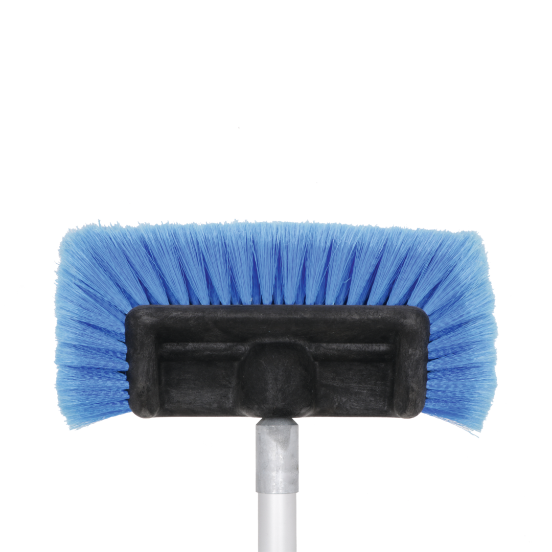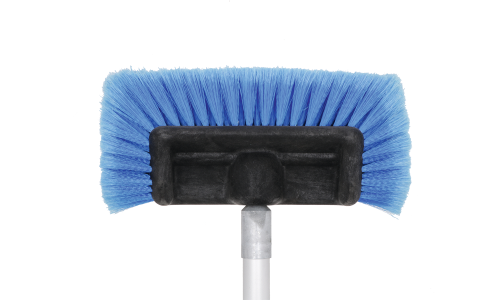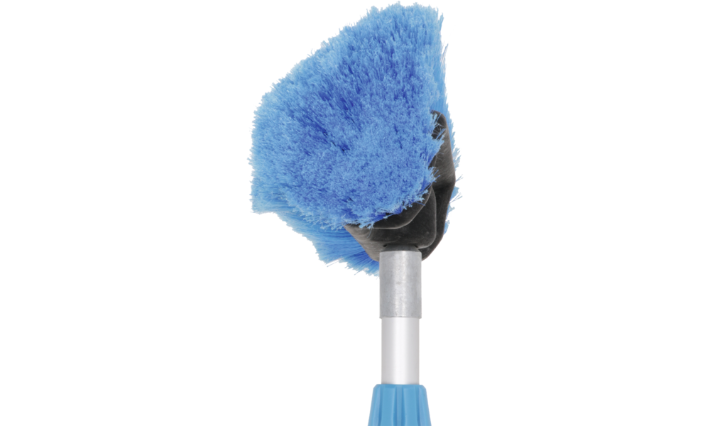 Waschbürste mit Polyesterspitzen und zusätzlichen Seitenbürsten. Eingebauter Shampoo-Anschluss und -Regler, Gardena-Wasseranschluss aus Messing und Alu-Teleskopstab (Länge 135 - 245 cm, ø 30 mm) mit zusätzlich verstellbarem Gelenkstück (Extra-Auszug 95 - 177 cm).