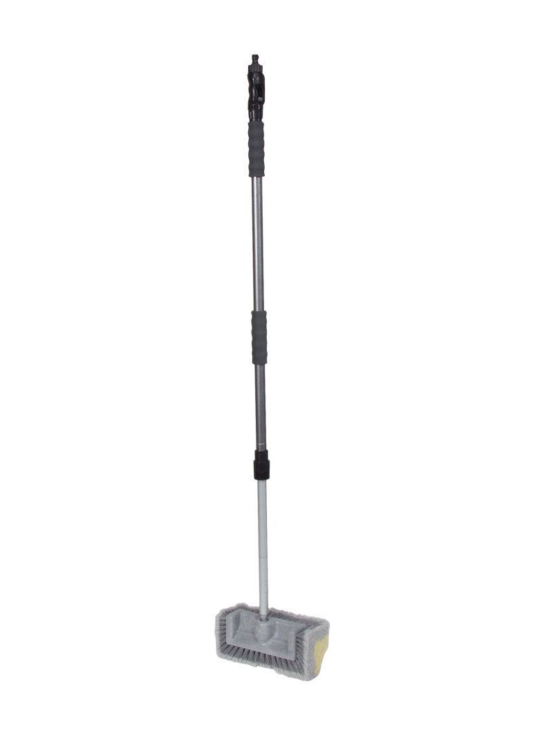 Waschbürste mit Alu-Teleskopstiel. Pflegeset mit neu entwickelter Waschbürste, um Beschädigungen an Fahrzeugen und Aufbauten zu vermeiden. Gewindeeinsatz aus Metall am Teleskopstiel. Mit regelbarem Schalter für die Wassermenge. Teleskopierbar bis 185 cm.