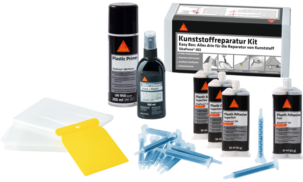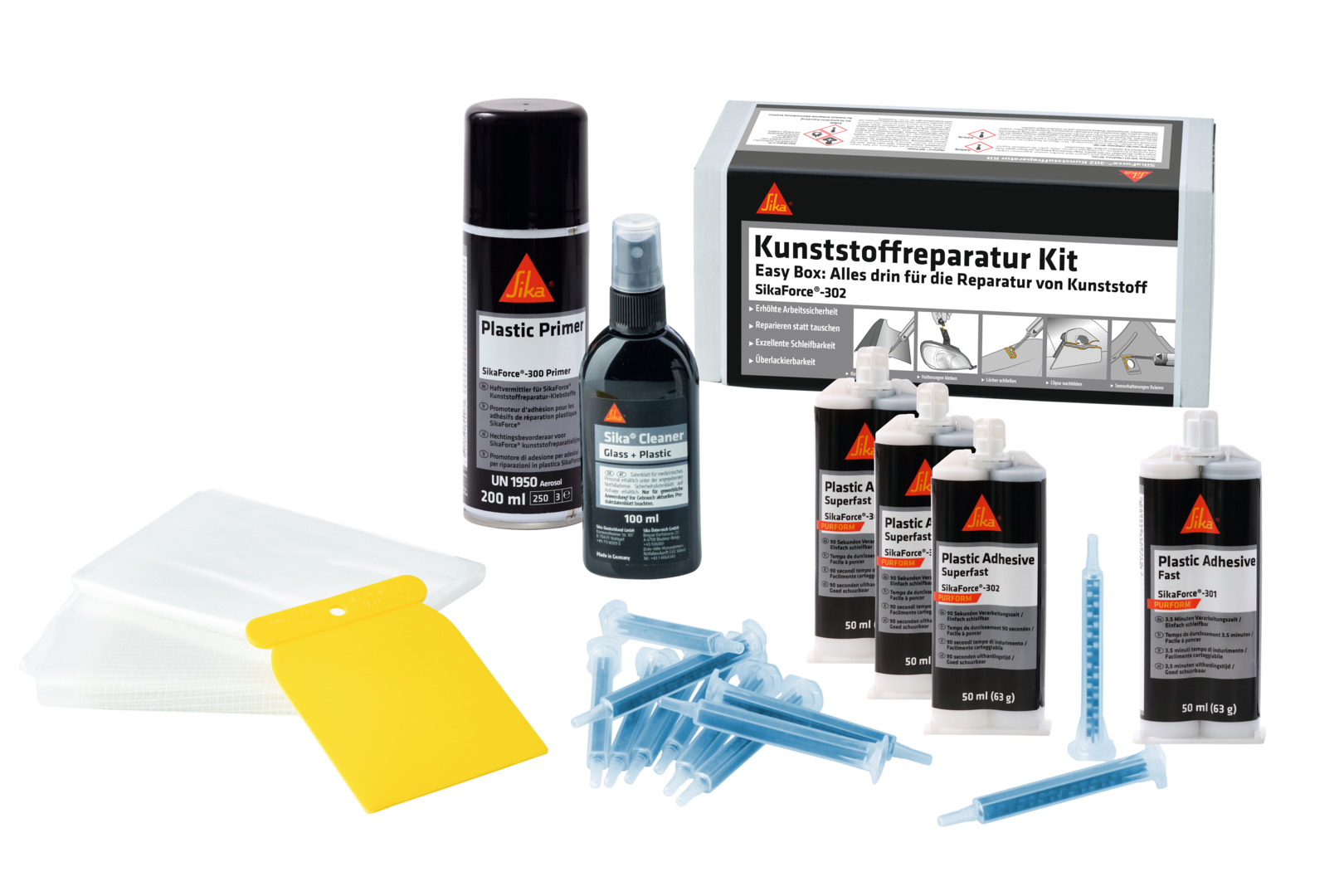 Das Kunststoffeparatur Kit Easy Box ist mit Produkten und Hilfsmitteln ausgestattet die für die Reparatur von Kunststoff benötigt werden.