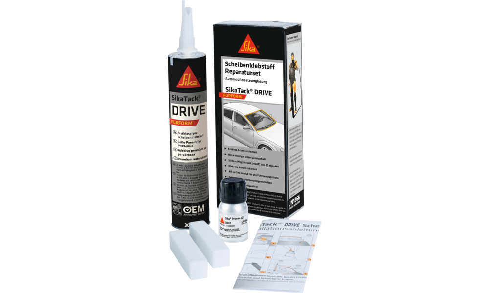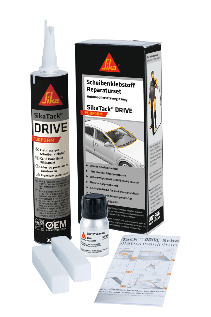 SikaTack® DRIVE (Purform®) ist ein kalt verarbeitbarer Scheibenklebstoff für die PKW-Ersatzverglasung mit einer sicheren Wegfahrzeit von 60 Minuten. Das System ist für den mobilen und stationären Einsatz ganzjährig geeignet und wurde geprüft nach FMVSS 212. Er ist ohne zusätzliches REACHTraining verarbeitbar.