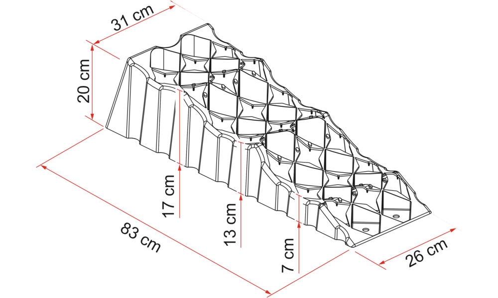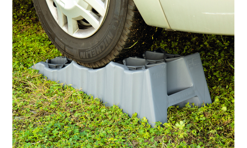 Die große Auflagefläche und die speziell geformten Stufen schützen den Reifen vor Verformung. Die neue, überarbeitete Struktur ist auf eine hohe Traglast und Anpassungsfähigkeit des Produkts an unebenes Gelände ausgelegt. Trotz seiner üppigeren Maße lässt sich der Stufenkeil, mit dem praktischen Handgriff an der Rückseite, bequem transportieren.