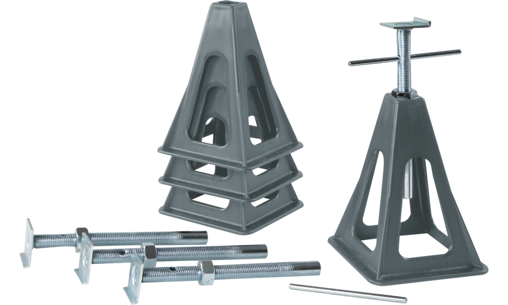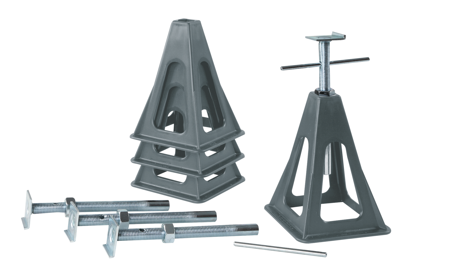 Platzsparend stapelbar. Verstellbar von 31 - 46 cm. Tragkraft/Stütze 750 kg. Gewicht pro Satz 3,2 kg.