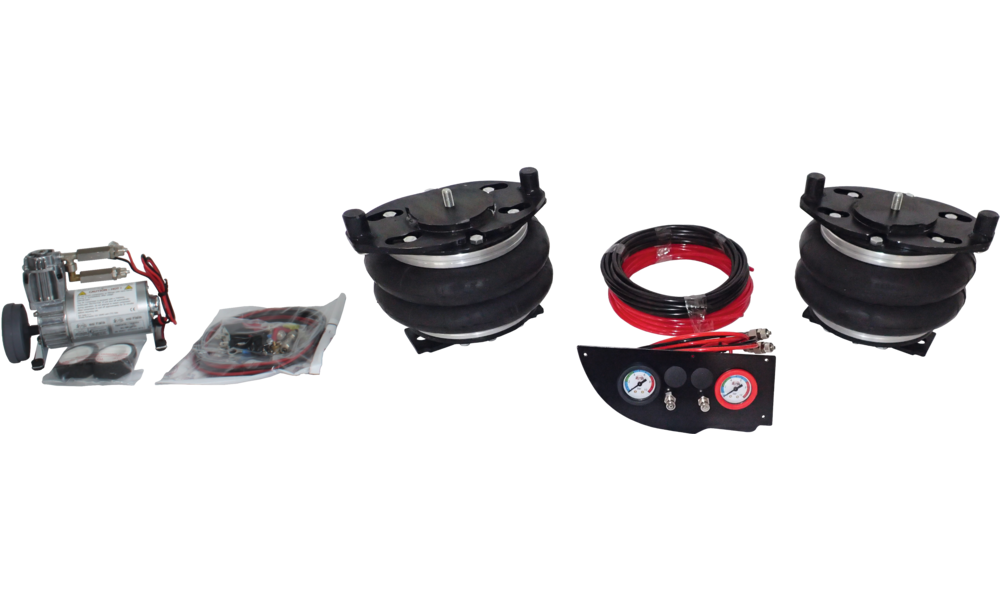 Zusätzliche Eigenschaften: Die Federung bleibt angenehm weich und komfortabel. Die Gummigewebe-Wandungen der Bälge und der Kompressor werden dank des geringen Luftdrucks geschont. Sicherheits-Schlauchdrossel-Rückschlagventile in 6 mm dicken Schläuchen, 2 Druckmanometer und 2 Füll-/Ablassventile. Durch Druckerhöhung zu Rangierzwecken kann das Heck weit angehoben werden, insbesondere während der Fährenbenutzung. Eine Seitenneigung wegen asymmetrischer Gewichtsaufteilung kann ausgeglichen werden und das Fahrzeug kann in geparktem Zustand auf unebenem Boden geradegestellt werden. Regelungs-Technik im Zweikammer-System, alle Zusatz-Luftfedern inklusive Zweifaltenbälgen, 12 Volt-Hochleistungs-Kompressor und Fahrerhausbedienteil.