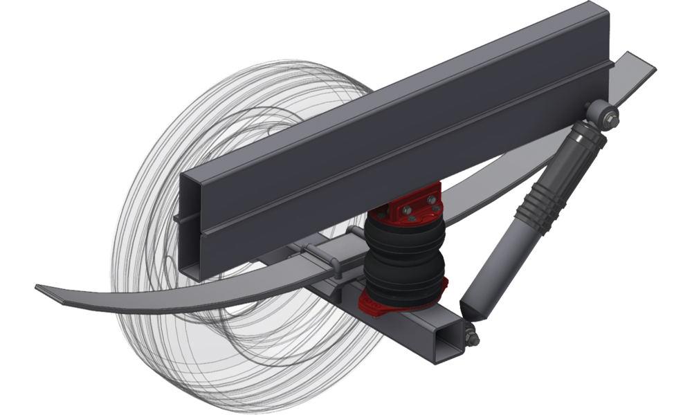 Zusatzluftfeder für die Hinterachse. Neben den Originalfedern werden kräftige Zusatzluftfedern montiert. Es gelten die gleichen Eigenschaften wie bei den Zusatzschraubenfedern beschrieben.