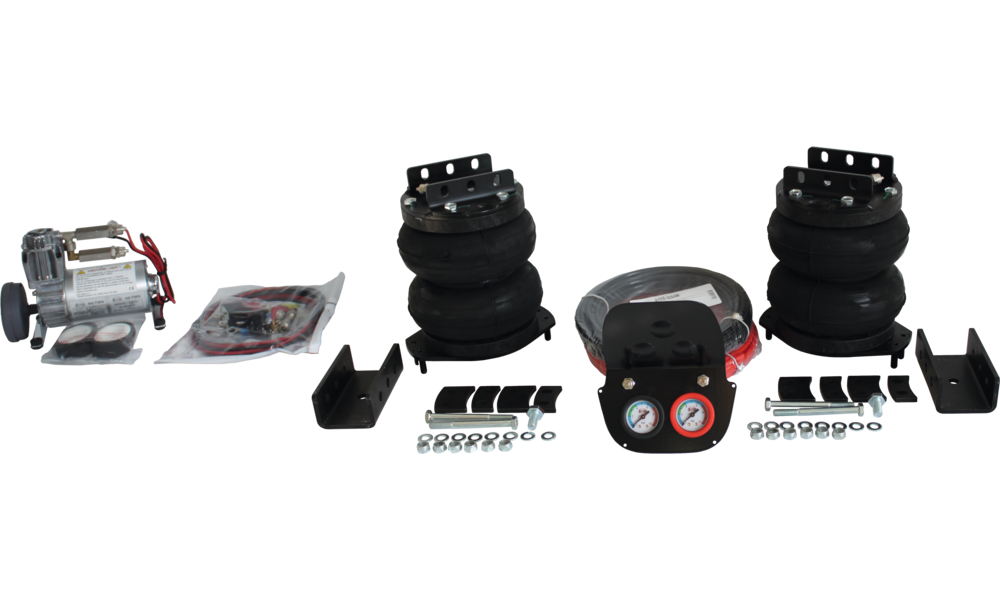 Zusätzliche Eigenschaften: Die Federung bleibt angenehm weich und komfortabel. Die Gummigewebe-Wandungen der Bälge und der Kompressor werden dank des geringen Luftdrucks geschont. Sicherheits-Schlauchdrossel-Rückschlagventile in 6 mm dicken Schläuchen, 2 Druckmanometer und 2 Füll-/Ablassventile. Durch Druckerhöhung zu Rangierzwecken kann das Heck weit angehoben werden, insbesondere während der Fährenbenutzung. Eine Seitenneigung wegen asymmetrischer Gewichtsaufteilung kann ausgeglichen werden und das Fahrzeug kann in geparktem Zustand auf unebenem Boden geradegestellt werden. Regelungs-Technik im Zweikammer-System, alle Zusatz-Luftfedern inklusive Zweifaltenbälgen, 12 Volt-Hochleistungs-Kompressor und Fahrerhausbedienteil.
