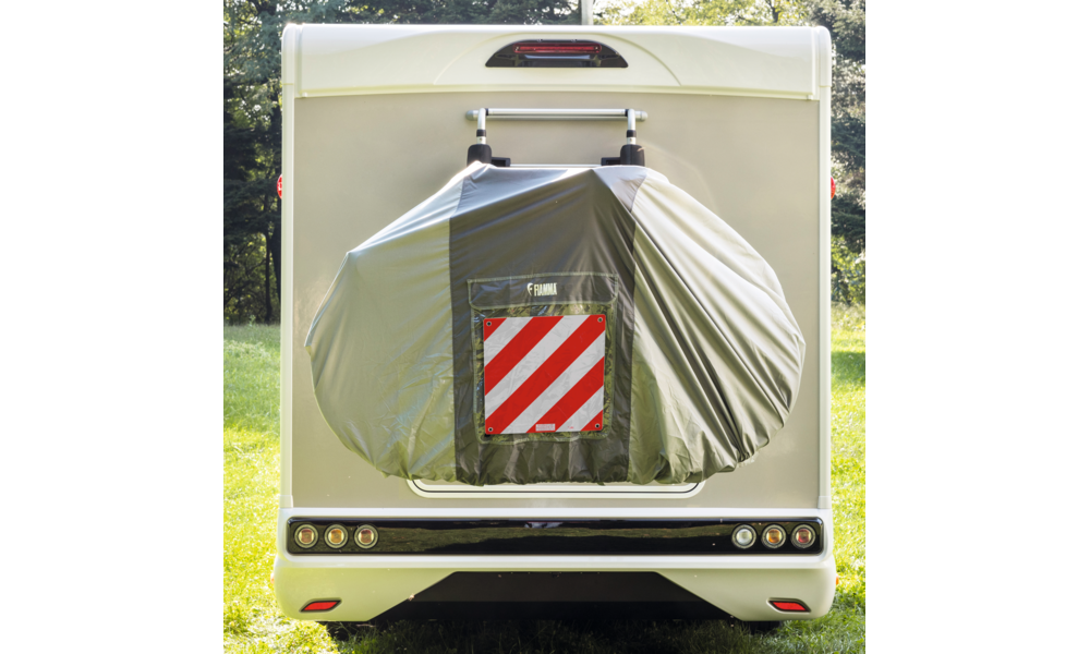 Verschluss auf der Unterseite mit Gummiband und Metallhaken, Polyestergewebe mit Polyurethanbeschichtung 300D (100 % Polyester), blickdicht und witterungsbeständig.