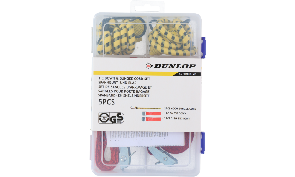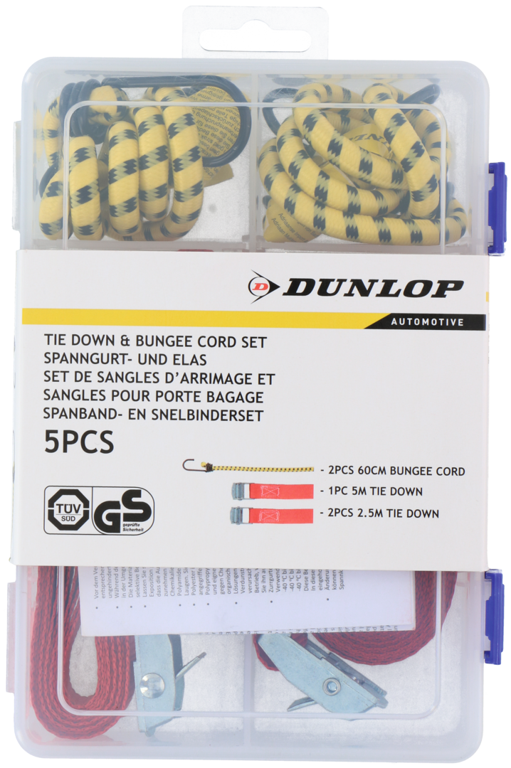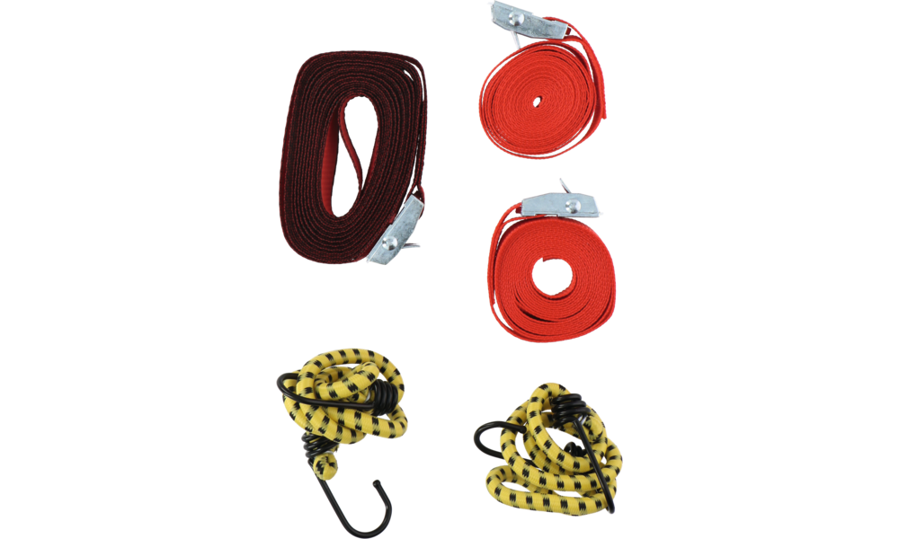 5-teiliges Set bestehend aus 2 Expanderkabeln 60 cm, 1 Abspanngurt 500 cm und 2 Abspanngurten 250 cm. Inklusive Kunststoffbox.