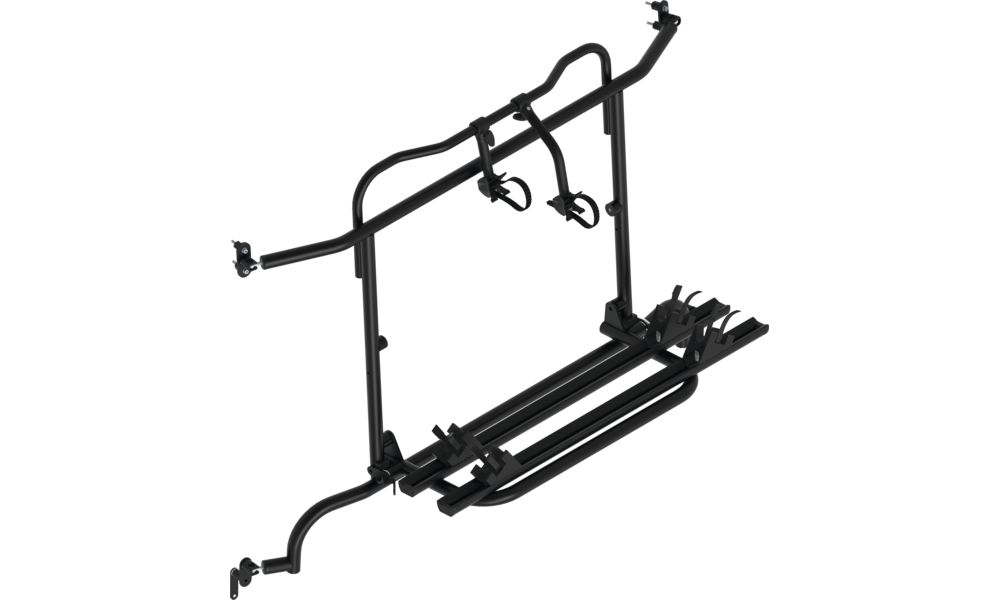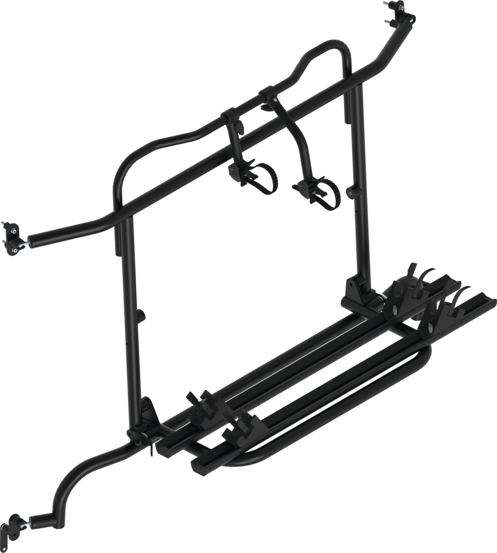 Für den Transport von max. 2 Fahrrädern. Trägerausstattung: Pulverbeschichtetes Aluminiumrohr in schwarz matt, ø 42 mm, 2 Aluminium Fahrradschienen 137 cm lang mit je 2 Radschalen inkl. 2 Ratschenbänder, 2 Befestigungskrallen.
