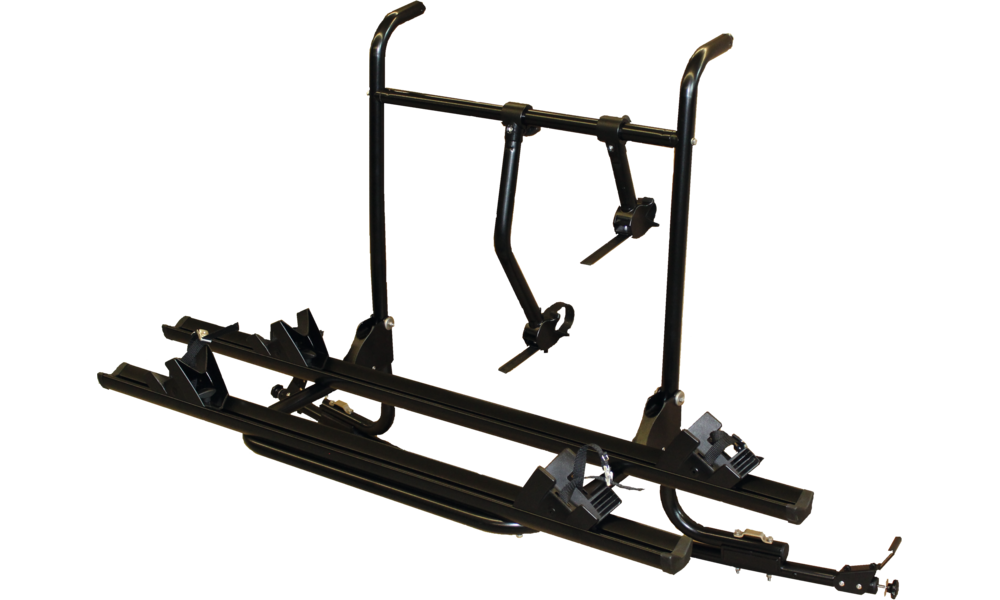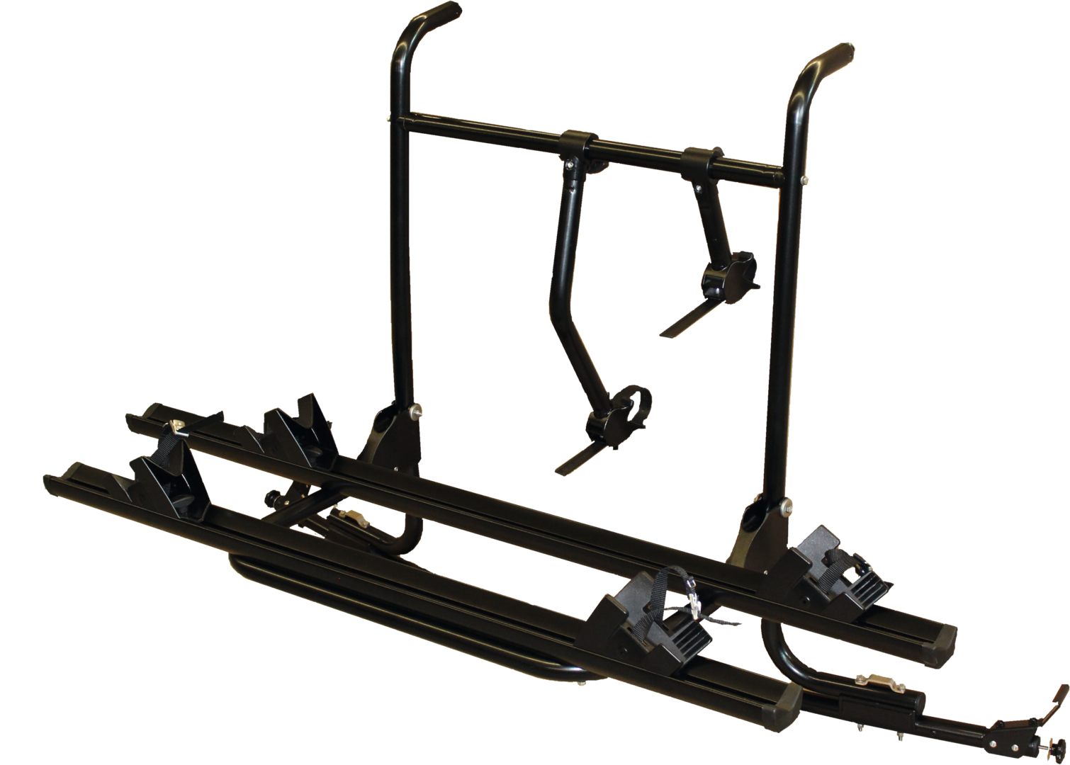 Zusätzliche Sicherung durch Abspanngurte. Einfache Montage. Grundrahmen aus eloxiertem Alu-Rohr, 2 Aluminium Fahrradschienen mit je 2 Radschalen und 2 Spanngurten, 2 Befestigungskrallen. Max. Beladung bis zu 2 Fahrräder, Pedelecs oder E-Bikes möglich.