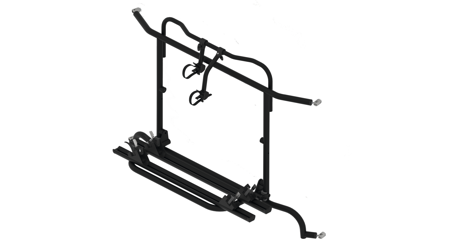 Für den Transport von max. 2 Fahrrädern. Trägerausstattung: Pulverbeschichtetes Aluminium-Rohr in schwarz matt, ø 42 mm, 2 Aluminium Fahrrad-schienen 137 cm lang mit je 2 Radschalen inkl. 2 Ratschenbänder, 2 Befestigungskrallen.