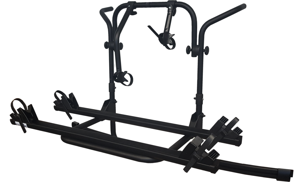 Grundrahmen aus schwarz pulverbeschichtetem Aluminium-Rohr ø 30 mm, 2 Aluminium-Fahrradschienen 125 cm lang mit je 2 Radschalen und 2 Spanngurten, mit 2 Befestigungskrallen. Max. Beladung 2 Fahrräder.