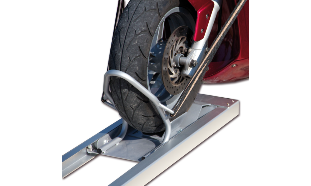 Über eine Auffahrschiene wird der Roller mit dem Vorderrad in die Radaufnahme des SMARTRAIL eingeschoben und über den mitgelieferten Lenkerspanngurt fixiert. Und jetzt kommt, was richtig Spaß macht: Mit einem Druck auf den Knopf der Fernbedienung fährt der Roller selbständig in die Heckgarage. Der Halter für Vorderräder von 8" bis 16" ist auf einem Schlitten montiert. Er wird durch einen Motor über einen Zahnriemen bewegt und lässt den Roller wie von Zauberhand in die Garage gleiten. Das Vorderrad steht auf dem Schlitten ca. 1 cm über dem Garagenboden. Ist der Roller mit dem Lenkerspanngurt verspannt, gewinnt man durch das SMARTRAIL bis zu 4 cm Höhe. Vielleicht die entscheidenden Zentimeter, damit ein Roller in die Garage passt.