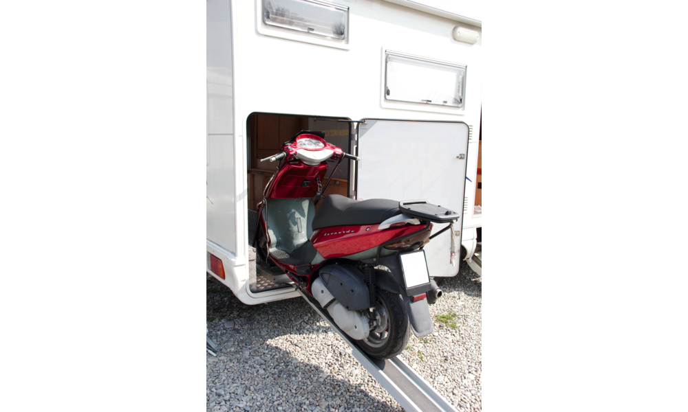 Mit dem elektrischen Garageneinzug SMARTRAIL lässt sich ein Roller einfach in der Garage verstauen.