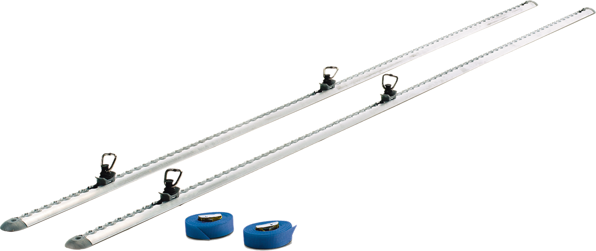 Set bestehend aus: 2 x Zurrschienen, 4 x Endstücke, 4 x Zurrösen und 2 x Spanngurt.