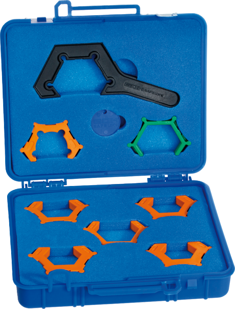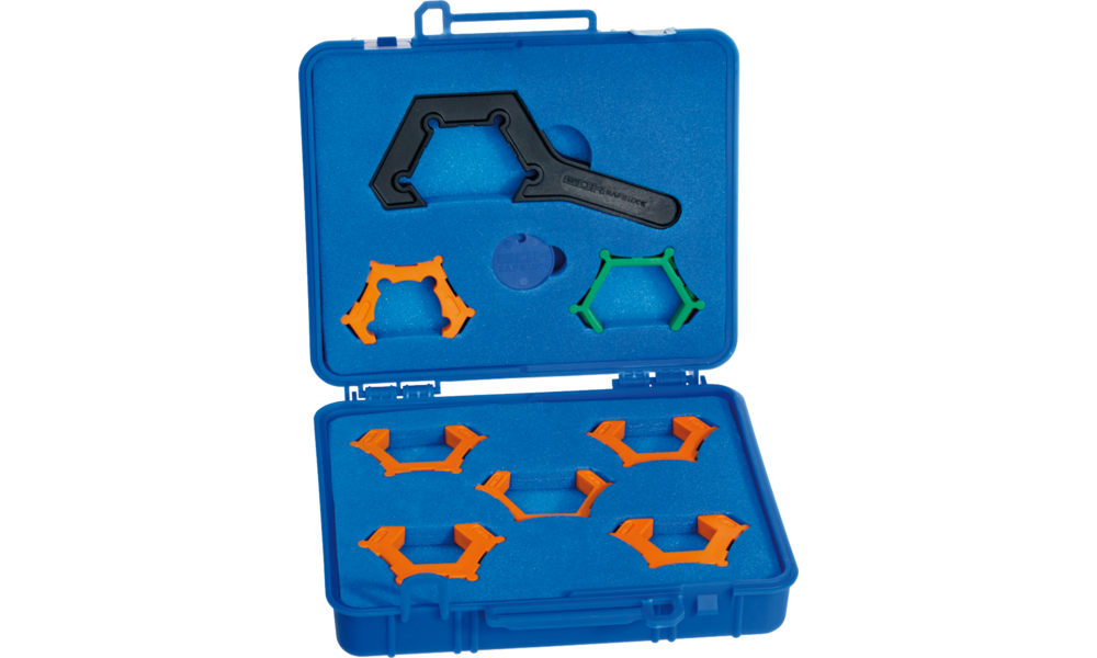 Vorteile und Ausstattung: nur ein Werkzeug mit sieben verschiedenen Wechseleinsätzen, einfaches und sicheres Wechselsystem, mit sechs Wechseleinsätzen (orange) passend für europäische Flaschenanschlüsse, mit einem Wechseleinsatz (grün) passend für Kleinflaschen-Verschlussmutter (Schutzkappe), Werkzeugkoffer mit Schaumstoffeinlage (HxBxT 14 x 15,3 x 4,9 cm), Werkstoff: Spezialpolyamid mit Glasfaserverstärkung (entwickelt für Werkzeuge).