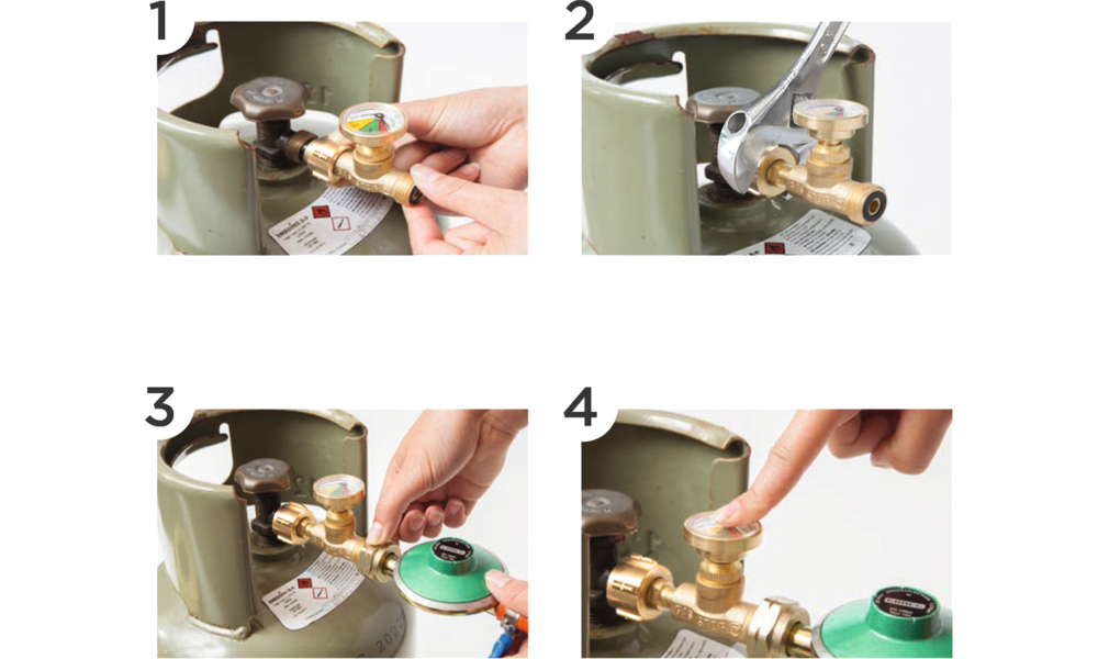 Den GasStop an die Gasflasche anschließen. GasStop mit entsprechendem Werkzeug festziehen. Den Regler (keinen mit Überströmventil)