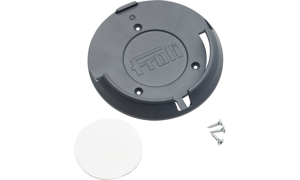 Lieferumfang: Halter für Schutzkappe, ø 100 mm, schiefergrau, 3 Schrauben und 1 Klebepad.
