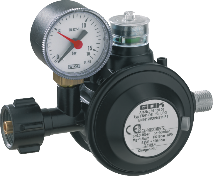 Überdruck-Sicherheitseinrichtung S2SR (ÜDS) zur Absicherung der Verbrauchsgeräte vor unzulässig hohem Druck, Sichtanzeige (grün/rot) mit optischem Signal (rot) bei Ausgangsdrücken über 80 mbar, verlängerter Eingangsstutzen, zur problemlosen Montage an z. B. Barbeque-Gasflaschen mit Kragen.
