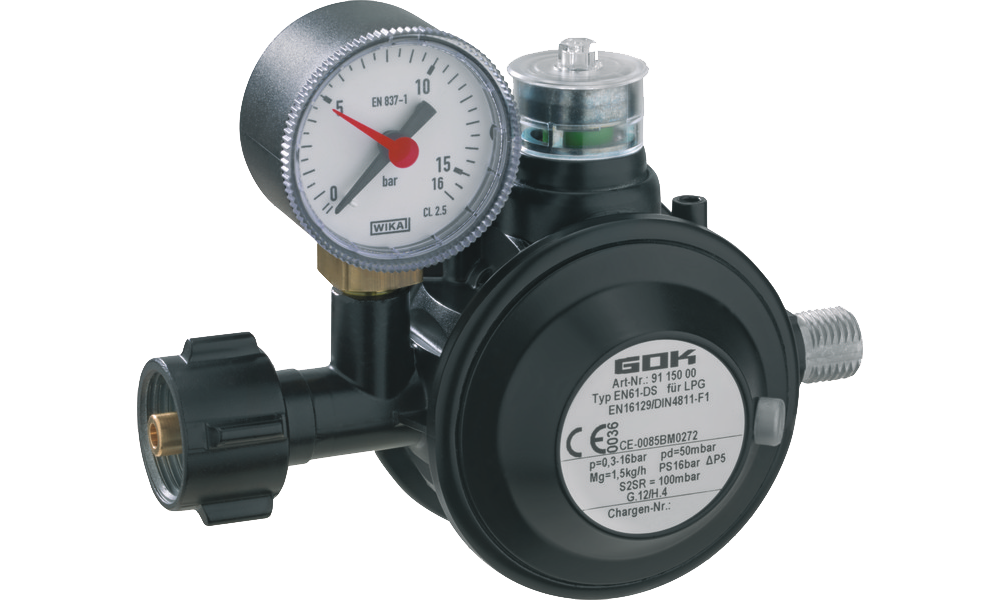 Mit Manometer zur Dichtheitsprüfung, z. B. bei Flaschenwechsel. KLF x G ¼ LH-KN, 50 mbar, 1,5 kg/h.