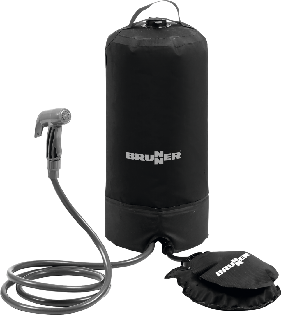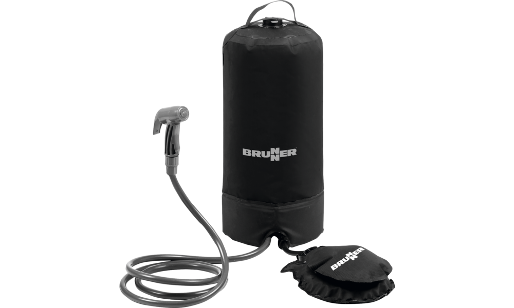 Outdoordusche mit Fußpumpe. Tragbares Duschset mit Fußpumpe. Die Länge des Brauseschlauchs beträgt 1,95 m.