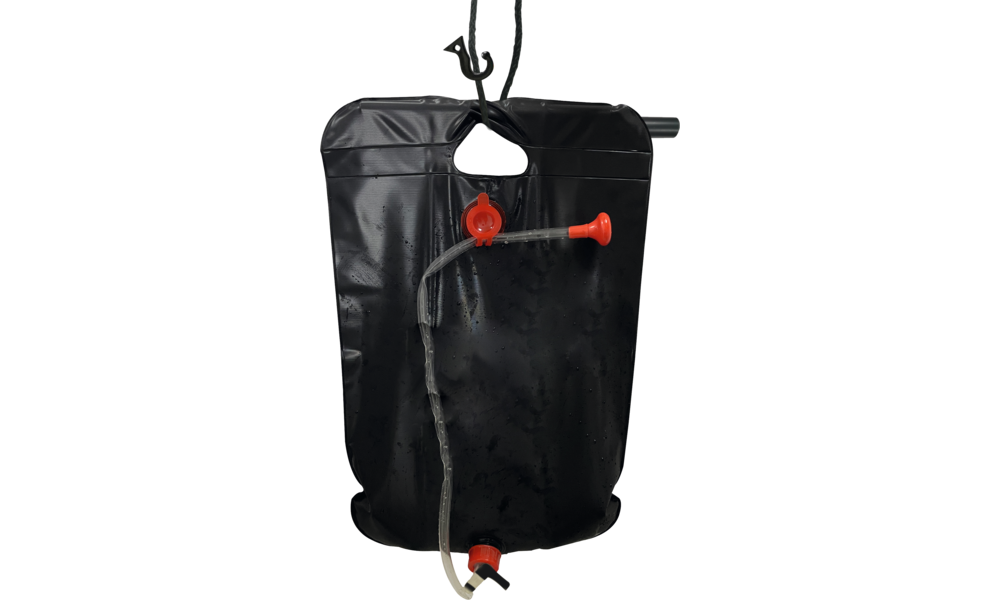 Solardusche. Einfach aufhängen und duschen. Warmes Wasser durch Sonnenenergie. Selbst bei wechselhaftem Wetter erwärmt sich das Wasser im ca. 20 l fassenden Behälter auf bis zu +40 °C. Solardusche aus atoxischem PVC. Regelbarer Wasserdurchfluss. Mit Trage-/Hängegriff.