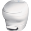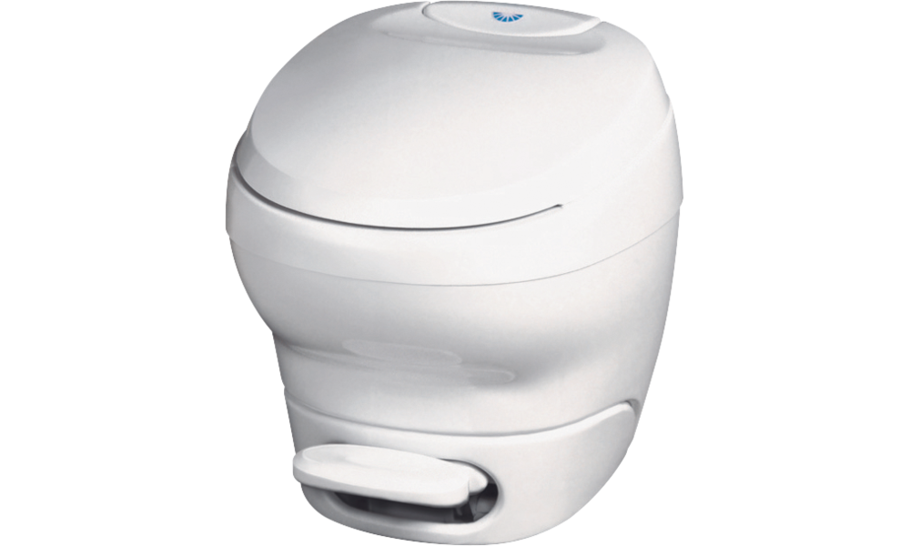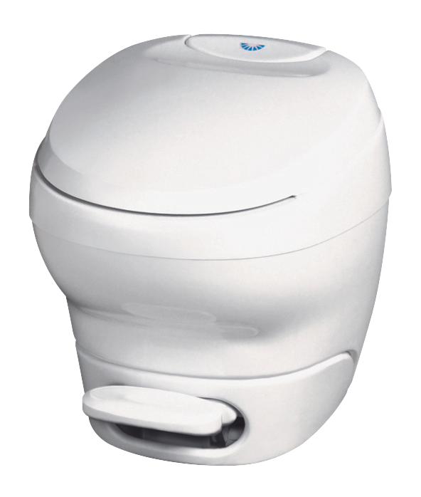 Bodenmontierte Toilette in amerikanischem Stil. Spülwasser aus einer eigenständigen Druckwasserversorgung. Der Fäkalientank befindet sich unter oder auf dem Boden.