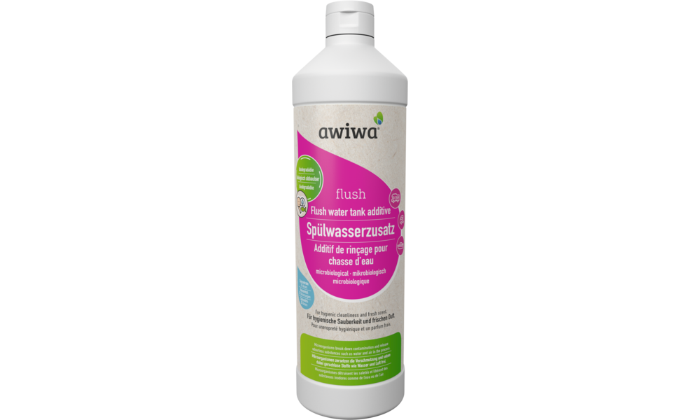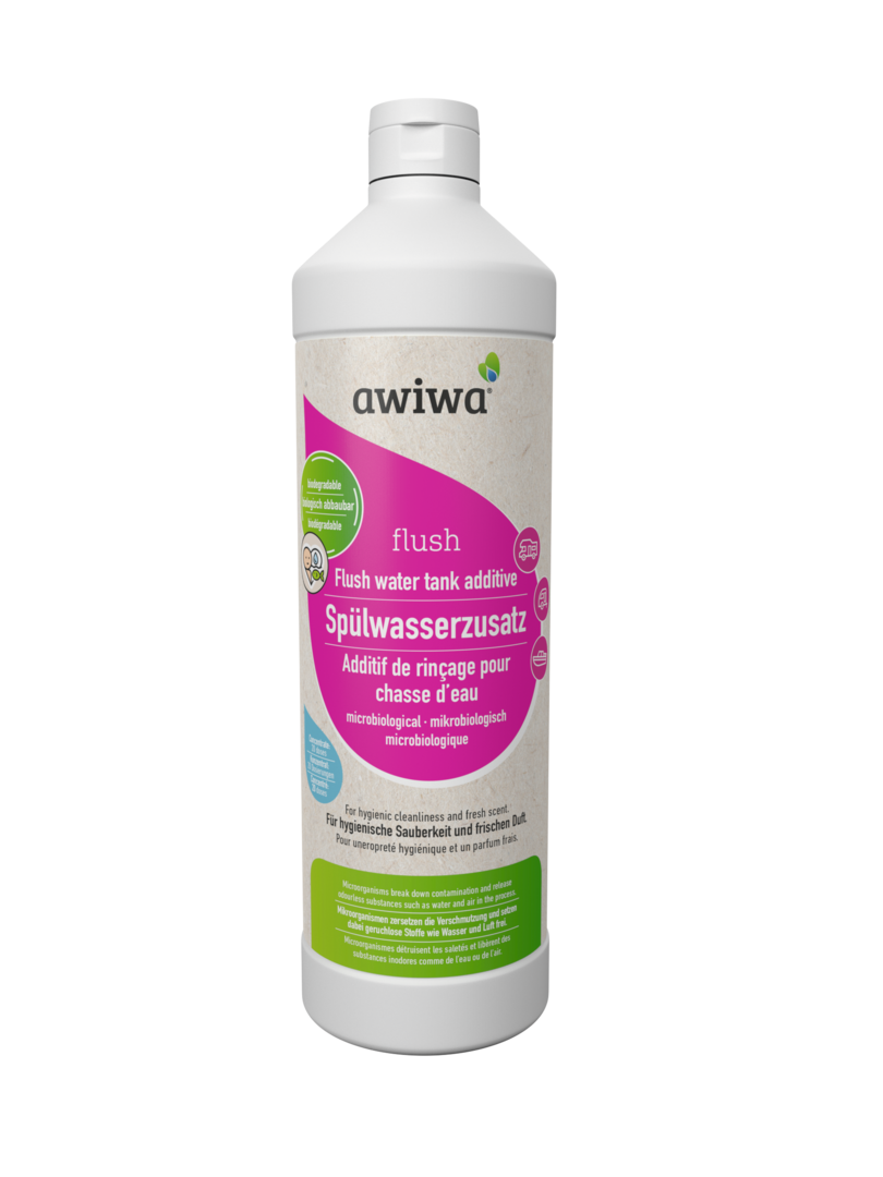 awiwa Spülwasserzusatz. Mikrobiologischer Spülwasserzusatz für den Einsatz in mobilen Toilettensystemen mit separatem Spülwassertank. awiwa Spülwasserzusatz setzt auf die natürliche Wirkung von Mikroorganismen, hält das Spülwasser sauber, sorgt für eine gleichmäßige Spülung und einen frischen Duft. Eine Schutzschicht verhindert Bakterienablagerungen, Schmutz- und Algenbildung werden verhindert. Besonders schonend zu Gummidichtungen, Schiebern sowie Kunststoff- und Keramikschüsseln und trägt so zur Langlebigkeit Ihrer mobilen Toilette bei. 1 Liter awiwa Spülwasserzusatz reicht für 20 Anwendungen.