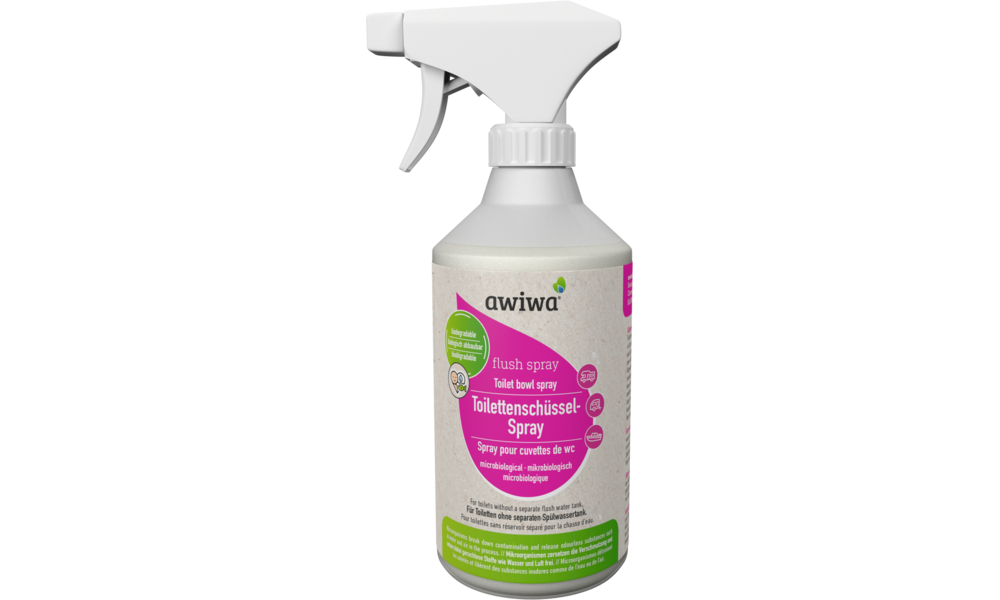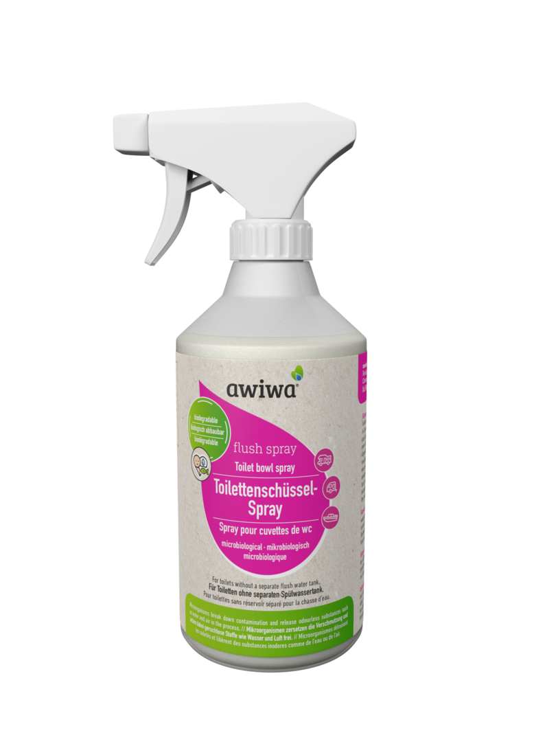 awiwa Toilettenschüsselspray. Ein mikrobiologisches Toilettenschüsselspray für den Einsatz in mobilen Toilettensystemen, die das Spülwasser aus dem zentralen Frischwassertank beziehen, wie z. B. in Caravans, Wohnmobilen und Booten. Ohne aggressive Chemikalien und leicht biologisch abbaubar. Unbedenklich für Mensch, Tier und Umwelt. Die einzigartige Kombination und Zusammensetzung aus natürlichen Mikroorganismen und Enzymen sorgt für eine hygienische Sauberkeit und eine gleichmäßige Spülung in der Toilette. awiwa Toilettenschüsselspray bildet eine Schutzschicht wodurch Rückstände weniger an der Toilettenschüssel haften bleiben und somit Wasser bei der Spülung gespart wird. Der angenehme Duft nach jeder Anwendung verleiht eine lang anhaltende Frische. Dank der natürlichen Inhaltstoffe ist es besonders schonend zu Gummidichtungen, Schiebern sowie Kunststoff- und Keramikschüsseln und trägt so zur Langlebigkeit Ihrer mobilen Toilette bei.