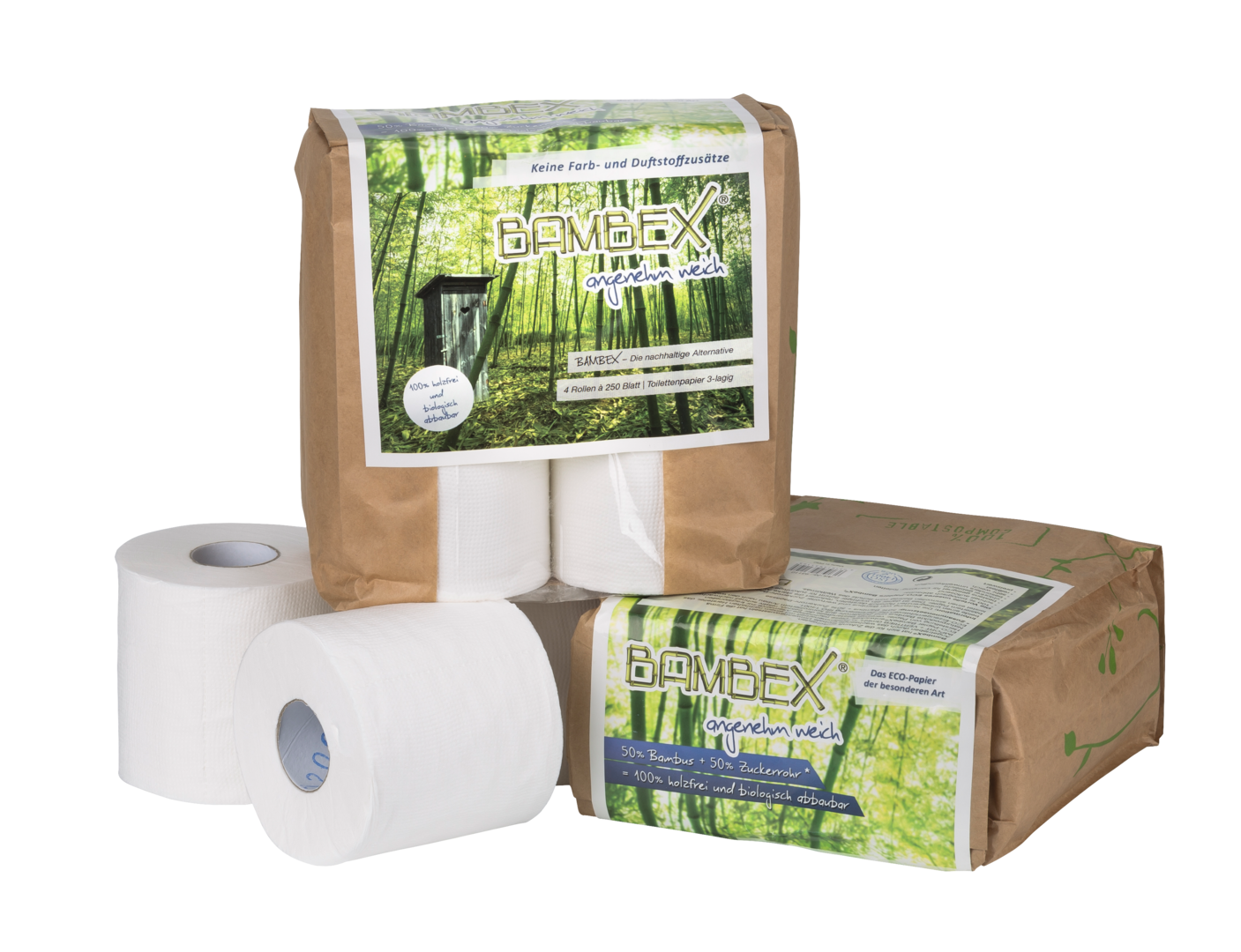 CO-Toilettenpapier BAMBEX. Die nachhaltige Alternative. Keine Farb- und Duft-stoffzusätze, angenehm weich, 100 % holzfrei und biologisch abbaubar. 3-lagiges Toilettenpapier - 4 Rollen á 250 Blatt.