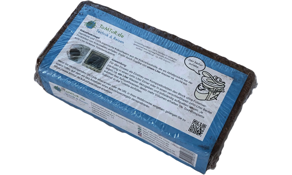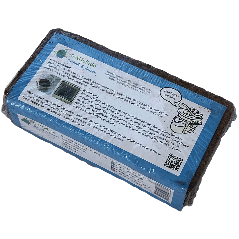 Kokosfaserziegel. Substrat für Komposttoiletten. Aus gepresster und getrockneter Kokosfaser. Rein biologisch, unverderblich, sehr lange lagerfähig, ungedüngt, frei von Steinen. Muss vor Verwendung aufquellen!