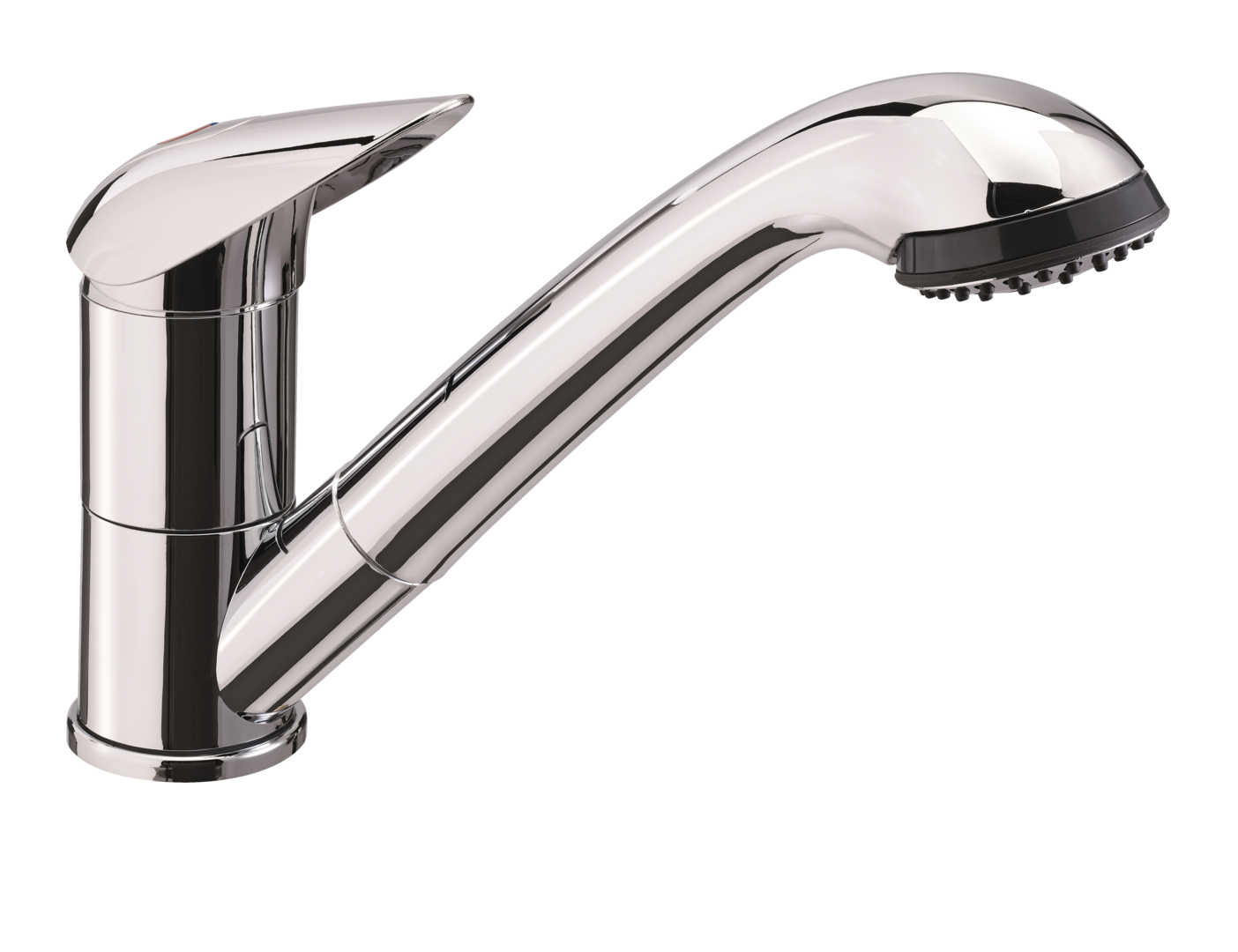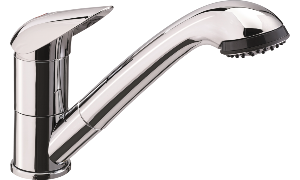 Einhebelmischer Keramik PELIKAN mit Brause Julia. Auslauf um 90° schwenkbar. Brause einstellbar auf „Strahl“ und „Dusche“.