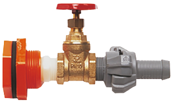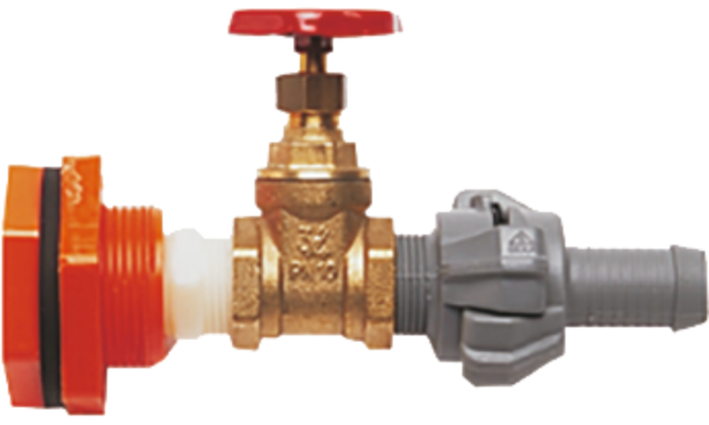 Entleerungsgarnitur. Einbau in jeden beliebigen Tank möglich. Verlängerung mit zwei Einschraubtüllen ¾" x 19 mm und 19 mm Spiralschlauch. Messing/LM 170 (PA). Anschlüsse ¾" x 19 mm.